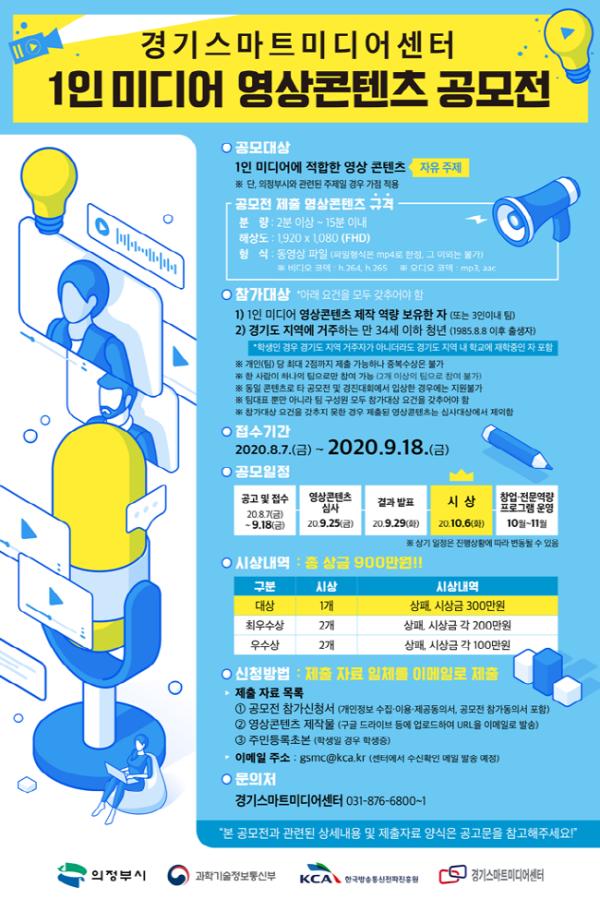 의정부시(시장 안병용)가 지원하고 한국방송통신전파진흥원이 운영하는 경기스마트미디어센터는 경기도 내 34세 이하 청년들을 대상으로 ‘1인 미디어 영상 콘텐츠 공모전’을 개최한다고 밝혔다.