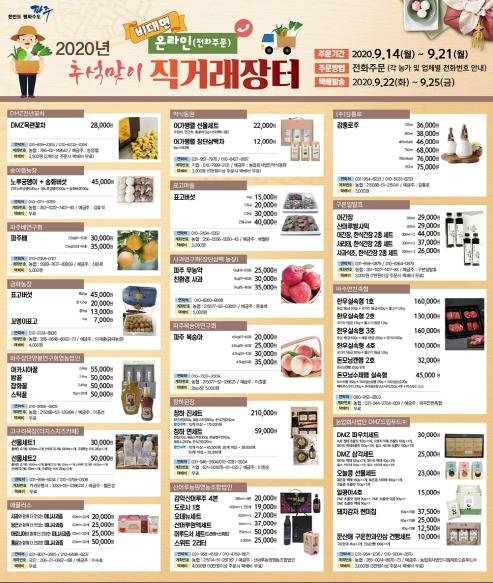 파주시는 민족 최대 명절인 추석을 앞두고 지역경제 활성화를 위한 2020년 추석맞이 온라인(전화주문) 직거래장터를 14일부터 21일까지 운영한다.
