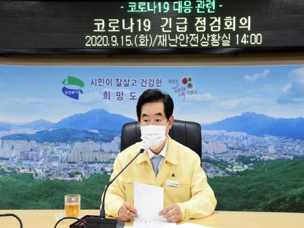 의정부시(시장 안병용)는 9월 15일 시청 재난안전상황실에서 부시장, 코로나-19 대응 관련 실국장 및 권역동 국장 등 30여 명이 모인 가운데 수도권 방역조치 조정에 따른 긴급 점검회의를 개최했다.