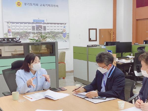 경기도의회 교육기획위원회 위원장 정윤경 의원(더불어민주당, 군포1)은 15일 교육기획위원회 협의실에서 경기도교육청 융합교육정책과 담당자들과 외국어 교육 및 문화예술 교육 주요 현안에 대한 협의 시간을 가졌다.