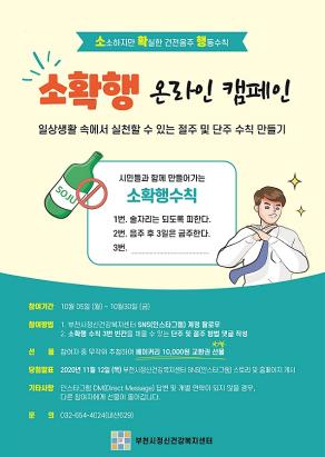 참여를 원하는 시민은 부천시정신건강복지센터 인스타그램 계정을 팔로우하고, ‘소확행 수칙’ 게시물에 나만의 방법 혹은 주변사람에게 추천하고 싶은 절주 및 단주 방법을 댓글로 작성하면 된다.