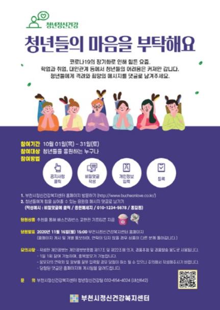 청년들에게 힘을 실어줄 수 있는 응원의 메시지는 부천시정신건강복지센터 홈페이지(http://www.bucheonlove.co.kr) 참여마당 탭의 공지사항에 댓글로 남기면 된다.