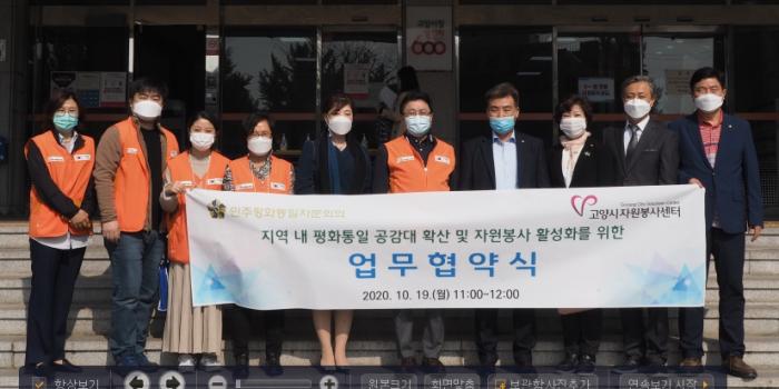 (회장 하동평)와 고양시자원봉사센터(센터장 허신용)업무협약(MOU)’을 체결, 평화와 번영의 한반도 시대를 열어가기 위한 협력체계를 구축하고 자원봉사 활성화를 위하여 노력하며 사회공헌 실천을 위해 상호협력해 나가기로 했다.