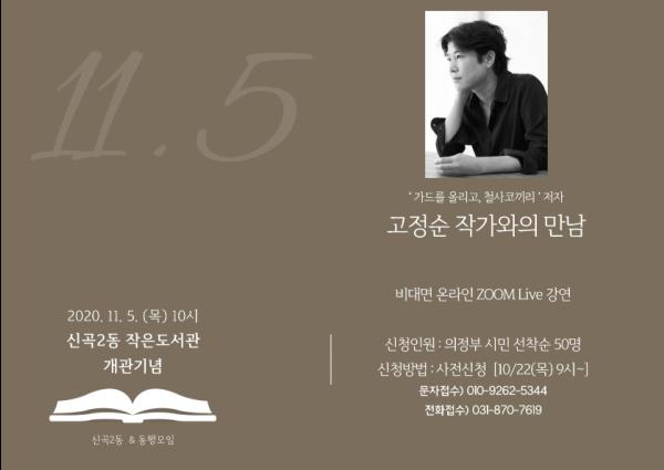 신곡2동은 작은도서관은 오는 11월 5일 작가와의 비대면 만남을 개최한다. 이번 강연회는 신곡2동과 작은도서관 소속 독서동아리‘동행’이 함께 주최하였으며, 민관이 함께 기획·준비하였다는 데에 큰 의의가 있다. ‘동행’은 관내 성인 회원 12명으로 구성되어 월 2회 운영하고 있는 주민 독서토론 동아리이다.