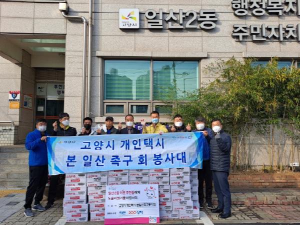 고양시 개인택시 본일산족구봉사회는 “십시일반, 일산 살리기”를 타이틀로 정하고 2013년 뜻이 맞는 고양시 개인택시 기사들이 모여 결성한 단체로, 매년 크고 작은 기부활동을 펼쳐왔으며, 올해는 봉사회 일원인 일산2동 지역사회보장협의체 권순모 위원장의 적극적인 유치로 일산2동에 라면 200상자를 기부했다.
