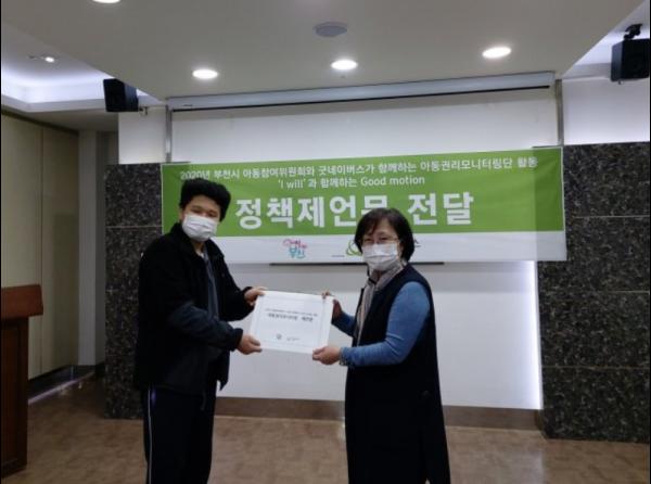 박화복 아동청소년과장은 “이제 첫 발걸음을 뗀 아동 권리 모니터링 굿모션 활동은 여러분의 권리를 지키기 위해 목소리를 낸 의미 있는 활동으로, 이러한 한 걸음 한 걸음이 아동 권리 옹호 문화 확산에 기여해 모든 아동이 행복한 도시, 부천으로 거듭나게 될 것으로 기대된다”며 “2021년은 감염병 걱정 없이 직접 만날 수 있기를 소망한다”고 전했다.