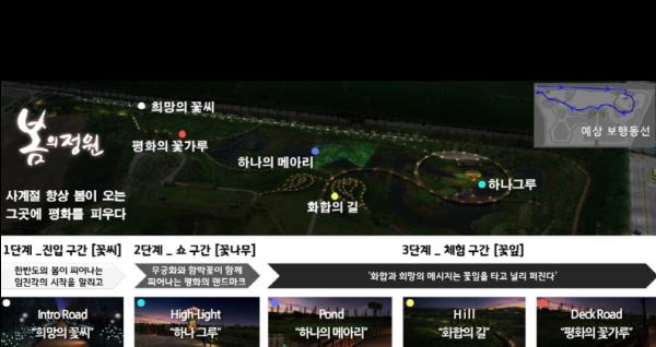 실제 민들레 홀씨가 커진 것 같은 조명과 꽃씨 오브제 조명으로 꽃씨가 흩날리듯 초입 부분을 연출했으며, 사람이 다가가면 저절로 활짝 피는 꽃 조형물 작품과 바람에 떠다니는 꽃씨처럼 움직이는 레이저가 메인콘텐츠인 하나그루로 이동하는 코스에서 몽환적인 분위기를 유도한다.