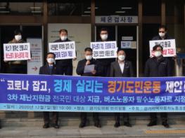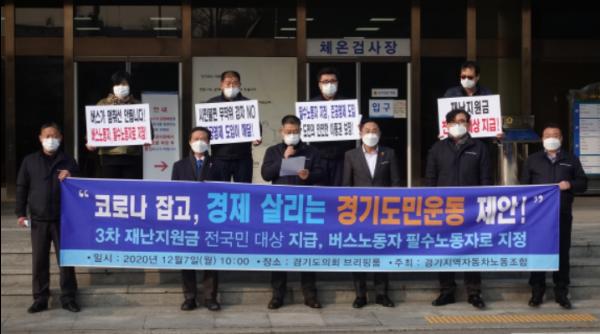 전국자동차노동조합연맹 경기지역자동차노동조합은 12월 7일 경기도의회 1충 현관 앞에서 기자회견을 갖고, “코로나 잡고 경제 살리는 경기도민운동”에 동참하며, 전국민을 대상으로 한 3차 재난지원금을 지역화페로 지급할 것을 촉구하였다.
