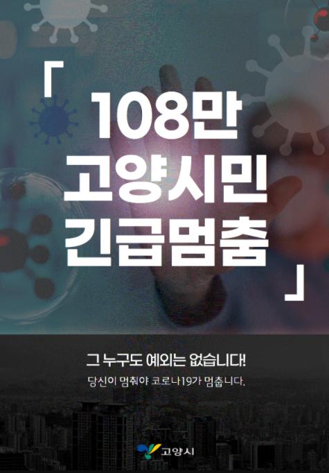 108만 고양시민 긴급 멈춤에 따라 기존 10인 이상 집회금지 명령은 별도 해제 시까지 유효하며, 가족 간 감염예방을 위해 확진자 가정의 접촉자는 1인 격리를 원칙으로, 불가 시 고양시가 운영하는 안심숙소에 분산 격리방침을 유지한다.