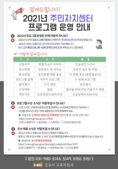 기타 자세한 사항은 시 홈페이지(http://www.gimpo.go.kr/learning/index.do)를 참고하거나 교육지원과 평생학습팀(☎031-980-5144, 5149, 5150, 5151)으로 문의하면 된다.