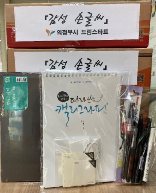또한 아동들은 학습한 캘리그라피를 활용하여 동봉되어 있는 책갈피와 스티커를 완성한 뒤 문자로 인증하는 미션을 수행했다.