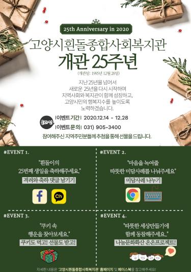 고양시는 고양시흰돌종합사회복지관이 개관 25주년을 기념하며 오는 14일(월)부터 28일(월)까지 시민 대상 온라인 이벤트를 진행한다고 밝혔다.