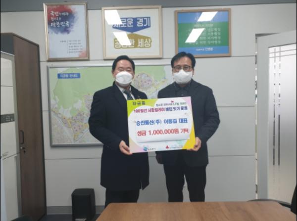 의정부시 자금동 주민센터는 12월 11일 승진통신(주)에서 자금동주민센터를 방문하여 100일간 사랑릴레이 배턴잇기 운동에 성금 100만원을 기탁했다고 밝혔다.