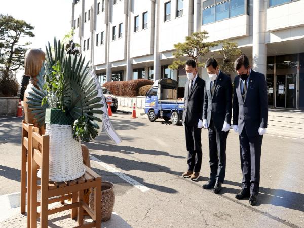 장현국 의장은 이날 오전 제348회 정례회 4차 본회의 종료 직후 의회 청사 앞 평화의 소녀상 앞에서 헌화와 묵념을 하며 성노예 피해자들의 희생을 기렸다.