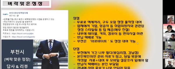 2부에서는 ‘더 많은 참여를 위한 조건’이라는 주제로 청년정책 랜선토크가 열렸다. 이날 사전 신청한 부천 시민들도 함께했다. 이들은 포스트 코로나19 시대에도 청년 활동은 비대면 활동이 뉴노멀이 될 것이라는 점에 공감하고 대면과 비대면 활동을 병행하기 위해 필요한 것에 대해 이야기를 나눴다. 또한, 코로나19 장기화로 청년들의 사회 진입 기회 축소에 따른 어려움을 지원하기 위한 실태조사, 맞춤형 지원 사업의 필요성을 강조했다.