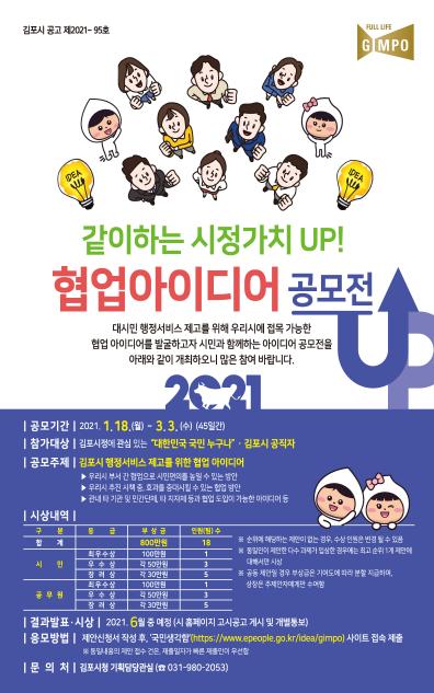 김포시가 행정협업으로 시민의 생활 속 작은 불편까지 적극적으로 해결하기 위해 시민과 함께하는 협업아이디어 공모전을 개최한다.