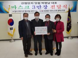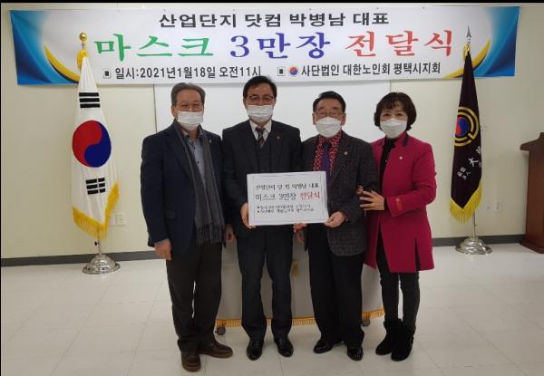 대한노인회 평택시지회에 마스크 3만 장을 기부한 박병남 대표는 “현재 코로나 19로 인하여 많은 어려움을 겪고 있는 평택시 어르신들의 건강을 지키는 작은 보탬이 되었으면 좋겠다”며 기부의사를 전했다.