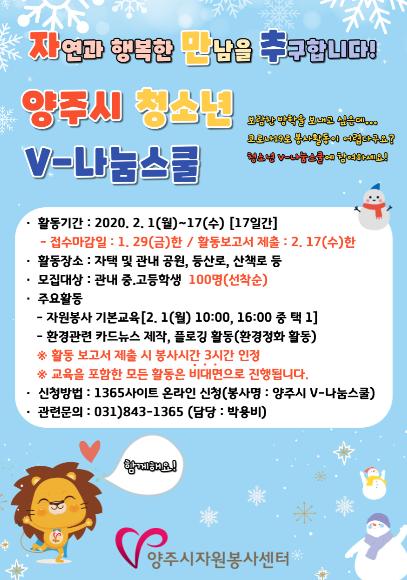 양주시자원봉사센터는 오는 2월 1일부터 17일까지 ‘2021 양주시 청소년 V-나눔스쿨’을 운영한다.