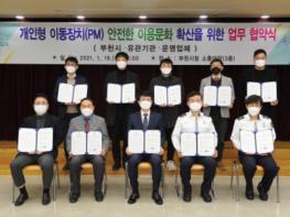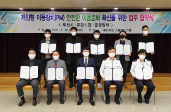 부천시는 19일 개인형 이동장치(PM, Personal Mobility)의 안전한 이용환경 조성과 올바른 이용문화 확산 등 협약기관 간 상호 협력체계 구축을 위한 업무협약을 체결했다.