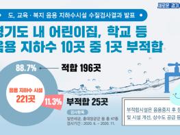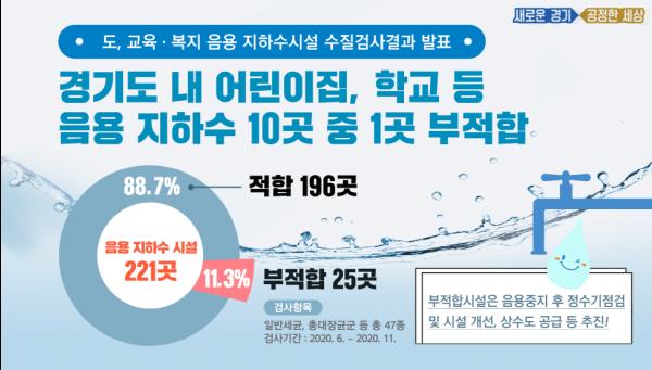 경기도가 도내 어린이집, 학교, 요양원 등 교육?복지시설에서 먹는 물로 지하수를 이용하는 221곳에 대한 수질검사를 실시한 결과 부적합시설이 25곳(11.3%)에 이르는 것으로 나타났다. 일부 시설에서는 수차례 점검과 개선명령에도 기준치의 수 십 배가 넘는 세균과 대장균군이 검출됐다.