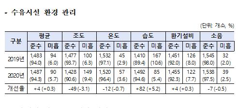 비치물품과 바닥 등 청결상태는 16.4%p(세면대 77.0%→ 93.4%)에서 19.5%p(바닥 청결상태 75.9%→ 95.4%) 개선율을 보였고, 조도 등 환경 상태도 평균 0.3%p(94.0%→ 94.3%) 향상된 것으로 조사되었다.