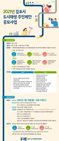 김포시 홈페이지 ‘고시공고’에 게시된 ‘2021 도시재생주민제안공모사업 공고’에서 자세한 내용을 확인할 수 있다.