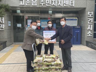 2021년 1월 21일 고촌읍 농촌지도자회는 고촌읍 행정복지센터 에 방문하여 공동답(共同畓)에서 직접 재배한 김포금쌀 4kg 29포를 도움이 필요한 이웃들에게 전달해달라고 기탁했다