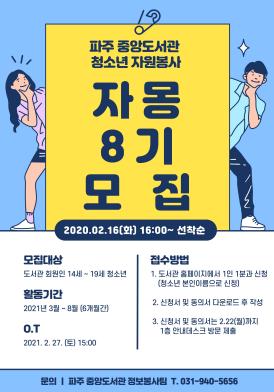 파주중앙도서관이 청소년들의 꿈과 끼를 다양한 활동으로 펼칠 수 있는 청소년 자원봉사동아리 ‘자몽’ 8기를 오는 16일 오후 4시부터 파주시도서관 홈페이지를 통해 모집한다.