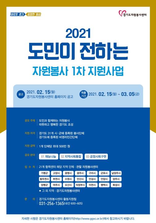 경기도자원봉사센터는 도민의 자원봉사 참여문화 확산과 사회통합 구현을 위해 '2021 도민이 전하는 자원봉사 지원사업’을 시행한다고 15일 밝혔다.