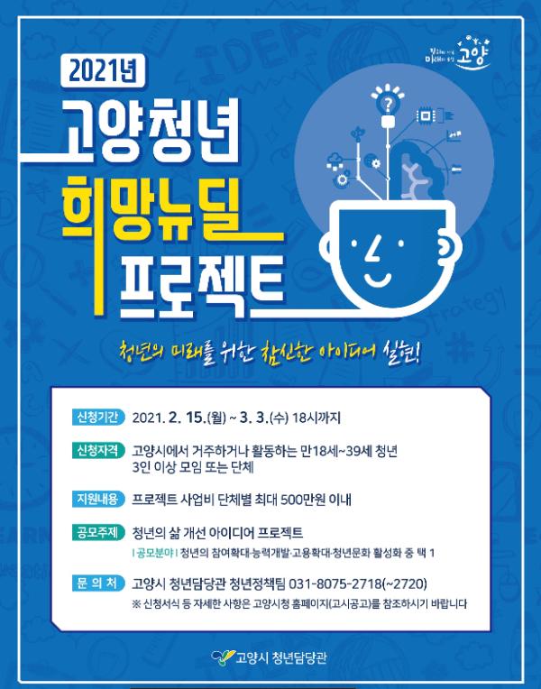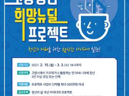 고양시가 청년 주도의 청년정책 발굴과 사회참여 역량 개발을 지원하기 위해 15일부터 '2021년 고양 청년 희망뉴딜 프로젝트’ 공모사업을 진행한다.