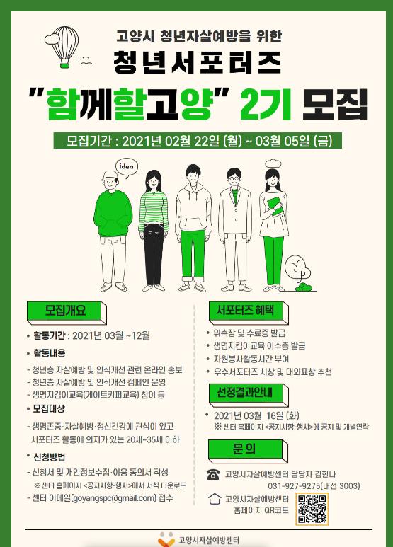 고양시 자살예방센터는 청년층 자살예방을 지원할 청년 서포터즈 ‘함께할고양’ 2기를 오는 22일부터 3월 5일까지 모집한다.