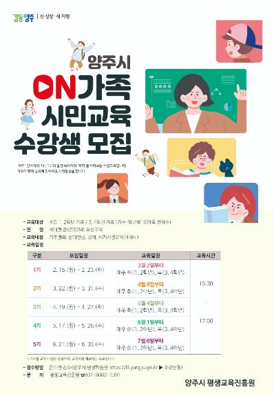 양주시는 오는 15일부터 초등 1~4학년을 대상으로 ‘ON-가족 시민교육’ 1기 수강생을 모집한다.