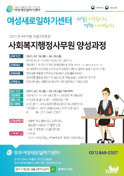 양주여성새로일하기센터는 오는 3월 5일까지 경력단절 여성을 대상으로 직업교육훈련 ‘사회복지행정사무원 양성과정’ 교육생을 모집한다.