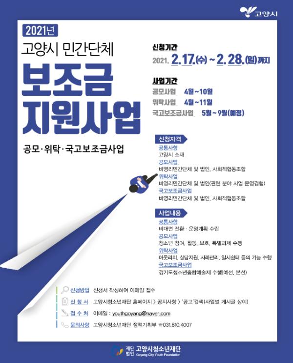 고양시청소년재단(이사장 이재준)이 고양시 관내 민간단체를 지원하여 다채로운 청소년 활동을 지역사회에 보급하고자 '2021년 고양시 민간단체 보조금 지원사업’을 참여 단체 공모에 나섰다.