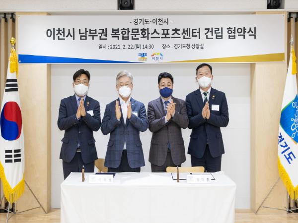 이재명 경기도지사는 22일 경기도청에서 엄태준 이천시장과 ‘이천시 남부권 복합문화스포츠센터 건립을 위한 업무협약’을 개최했다. 협약식에는 최만식 경기도의회 문화체육관광위원장과 김인영 도의원이 함께 했다.