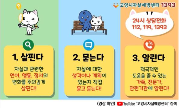 ‘자살예방 우리가 함께 할 고양’이라는 주제의 이 동영상은 힘들어하고 있는 슬픔이를 고양고양이가 생명지킴이(게이트키퍼) 행동지침에 따라 ▲살피고 ▲묻고 ▲알리는 내용으로 구성되어 있다.