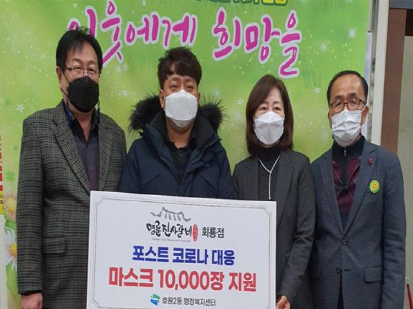 의정부시 호원2동 행정복지센터는 명륜진사갈비 회룡점가 2월 22일 코로나19로 어려움을 겪고 있는 취약계층에 전달해 달라며 마스크 1만 3천 매를 기탁했다고 밝혔다.