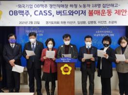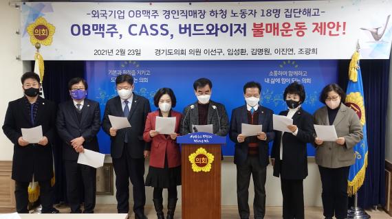 경기도의회 염종현 도의원(더불어민주당, 부천1)외 8명은 2월23일(화) 경기도의회 브리핑룸에서 OB맥주, CASS, 버드와이저 맥주 불매운동을 제안했다.