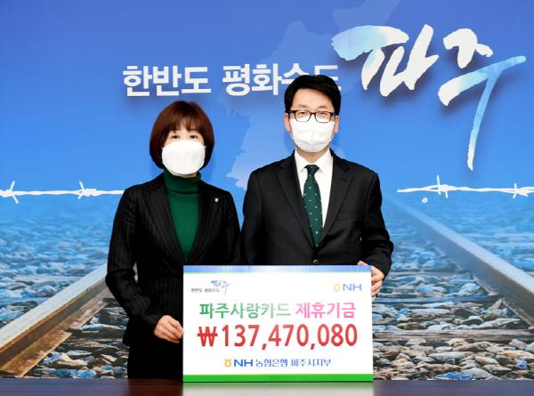 파주시는 지난 24일 NH농협은행 파주시지부로부터 파주사랑카드 등 제휴카드 적립기금 1억 3,747만 80원을 전달받았다고 밝혔다.