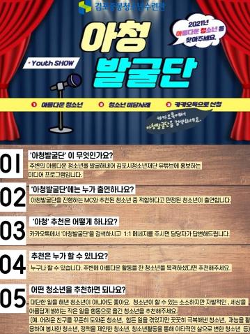 이 프로그램에 출연하고자 하는 청소년 혹은 추천하고자 하는 누구나 카카오톡 오픈채팅방 ‘아청발굴단’을 검색하고 1:1 메시지로 접수하면 된다.