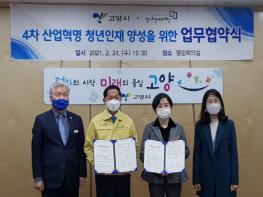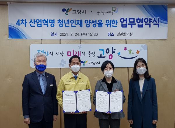 경기도일자리재단과 고양시가 24일 고양시청에서 제윤경 경기도일자리재단 대표이사, 이재준 고양시장 등이 참석한 가운데 '4차 산업 디지털신기술 청년인재 양성을 위한 협업체계 구축’ 업무협약을 체결했다.