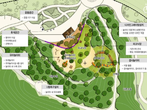 부지 내에는 아이들이 흥미를 가지고 즐겁게 뛰어놀 수 있도록 유아놀이시설 4종이 포함된 모험놀이시설과 지형을 활용한 경사놀이터, 모래놀이터 등 다양한 놀이시설이 설치된다.