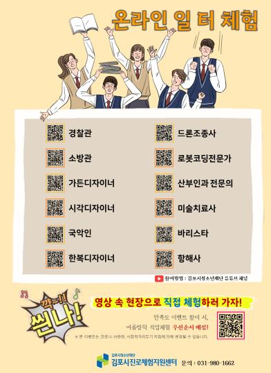 이에 진로센터에서는 비대면으로 일 터 현장의 전문가들을 만날 수 있도록 ‘온라인 일 터 체험’을 진행한다. 2월~3월 매 25일 업로드 되는 이번 프로그램은 공공(기관), 의료, 예술, 과학, 기술, 체육 등 10개 분야 25개 체험처가 참여하며 온라인(김포시청소년재단 유튜브 채널)을 통해 참여가 가능하다. 또한, 참여자 대상 이벤트를 통하여 하계방학기간 온라인으로 만나는 체험처에 직접 방문하여 체험해 볼 수 있는 기회까지 제공된다.