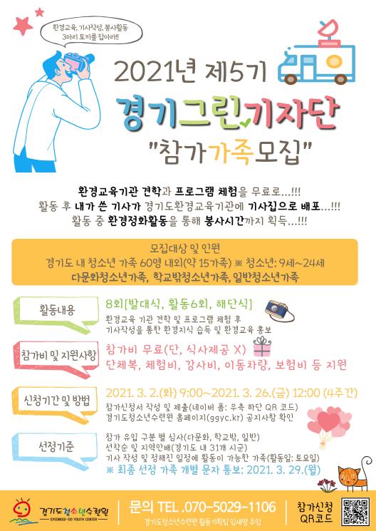 재단법인 경기도청소년수련원이 부모와 자녀가 함께 환경의 중요성을 공유하고 생활 속 올바른 환경보호 습관을 배울 수 있는 제5기 경기그린기자단을 모집한다.