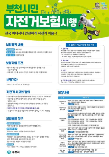 특히, 부천시에 등록된 자전거에 한하여 지급되던 대인배상은 올해부터 등록 여부와 관계없이 전 시민이 300만원 한도(자부담 10만원)에서 보상받을 수 있다.
