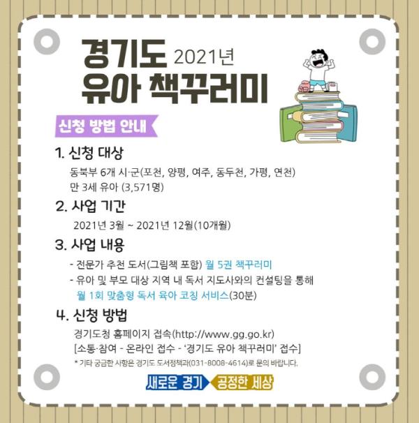 7일 경기도에 따르면 도는 포천, 양평, 여주, 동두천, 가평, 연천 등 경기 동북부 지역 6개 시군을 대상으로 이달 15일부터 이런 내용을 담은 ‘유아 책꾸러미’ 사업을 시행하기로 하고 경기도 홈페이지를 통해 신청자 모집에 들어갔다.