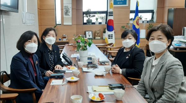 경기도의회 문경희 부의장(더민주, 남양주2)은 김경희(더민주, 고양6)·전승희(더민주, 비례), 김유임 청와대 여성가족비서관과 함께 ‘3.8 세계 여성의 날’을 기념하여 여성들의 인권 강화, 장애여성기본법 제정의 필요성, 아동학대 예방을 위한 인식개선 교육 강화 관련 정담회를 개최했다.