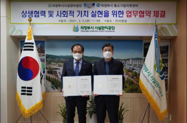 의정부시시설관리공단은 지난 3월 5일 의정부시 중소기업지원센터와 사회적 가치 실현을 위한 업무협약을 맺고 상호교류 협력을 다짐하였다.