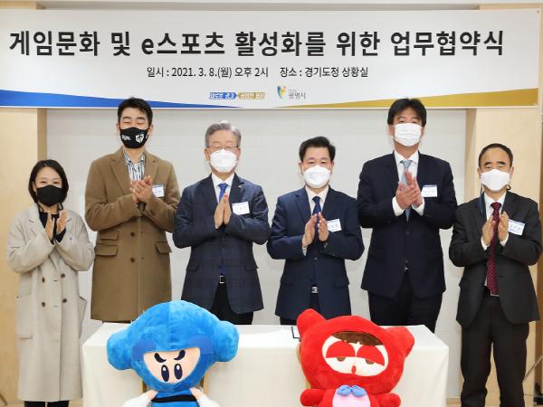 이재명 경기도지사와 박승원 광명시장은 8일 경기도청에서 ‘경기도 게임 문화 및 이(e)스포츠 활성화’ 추진을 위한 논의를 진행하고 업무협약을 체결했다. 협약식에는 조수현 게임문화재단 사무국장, 이승용 젠지(Gen.G) 이(e)스포츠 구단 이사, 이충명 게임과몰입힐링센터 실장도 참석했다.