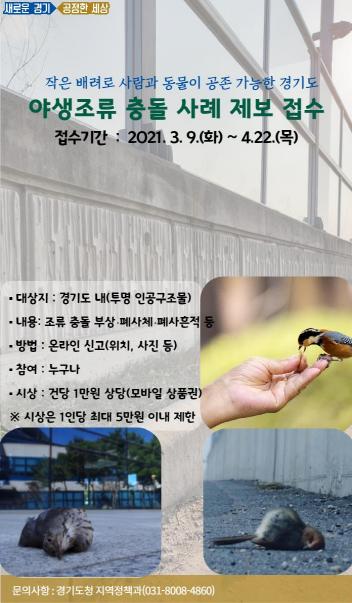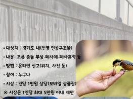 경기도가 야생조류가 방음벽, 건물유리 외벽 등 투명 인공구조물에 부딪혀 죽거나 부상당하는 조류 충돌사고 사례에 대해 도민 제보를 받는다.